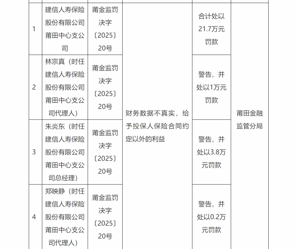 朱炎东(时任建信人寿保险股份有限公司莆田中心支公司总经理),被警告并处以3.8万元罚款;