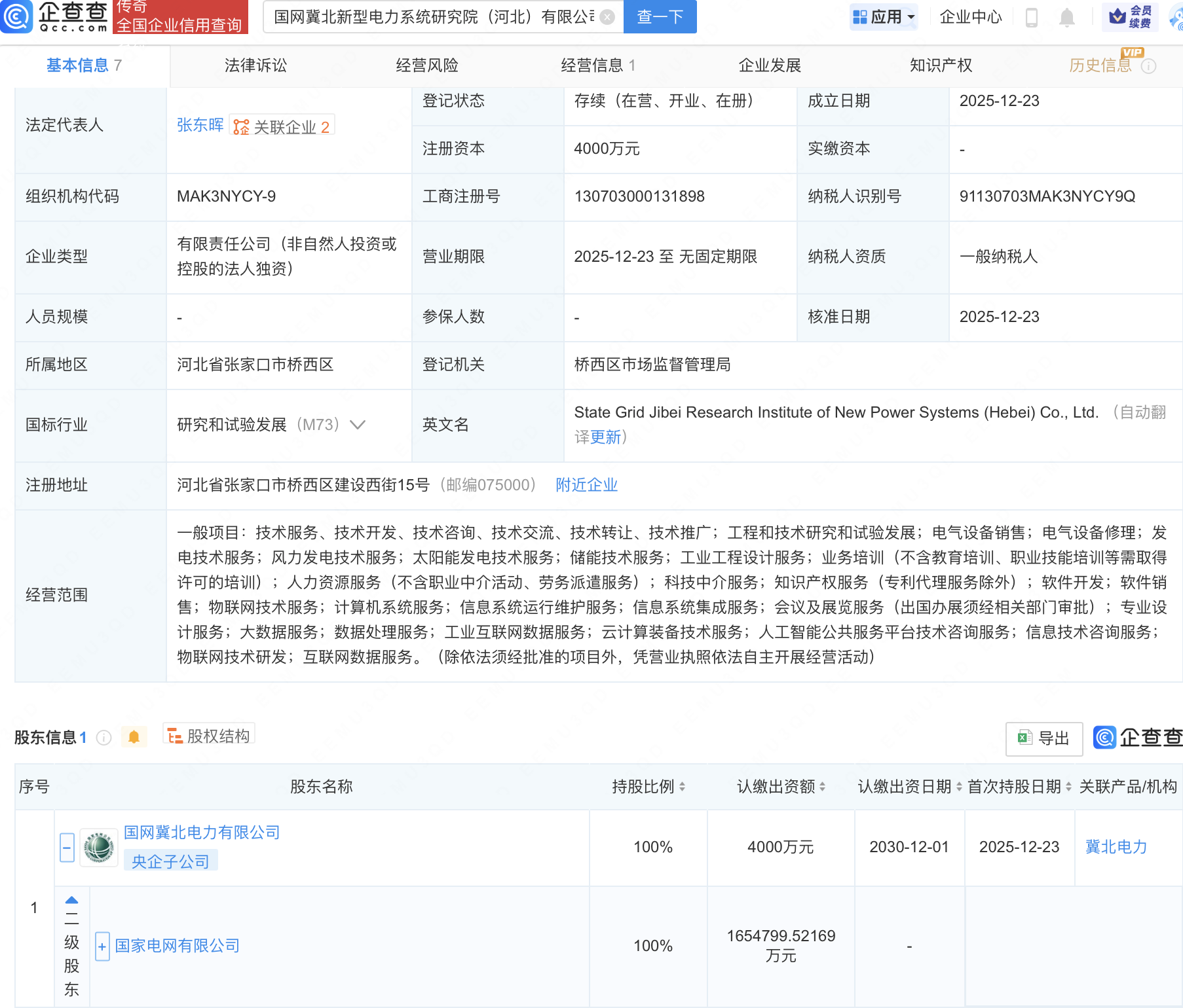 近日,国网冀北新型电力系统研究院(河北)有限公司成立钜阵资本,经营范围包含:大数据服务;数据处理服务;工业互联网数据服务;云计算装备技术服务;人工智能公共服务平台技术咨询服务等。企查查股权穿透显示,该公司由国家电网有限公司间接全资持股。