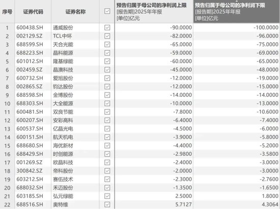 上海证券报记者通过Choice统计,截至1月24日,光伏产业链已发布2025年业绩预告的公司有22家,其中20家亏损。通威股份最高预亏达100亿元,TCL中环、天合光能、晶科能源、隆基绿能、晶澳科技等均预告将出现数十亿元大额亏损。
